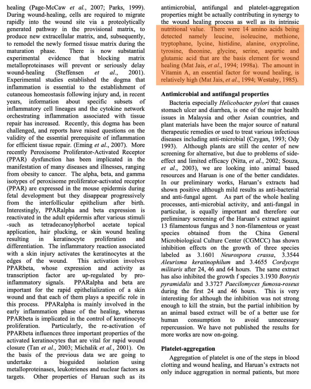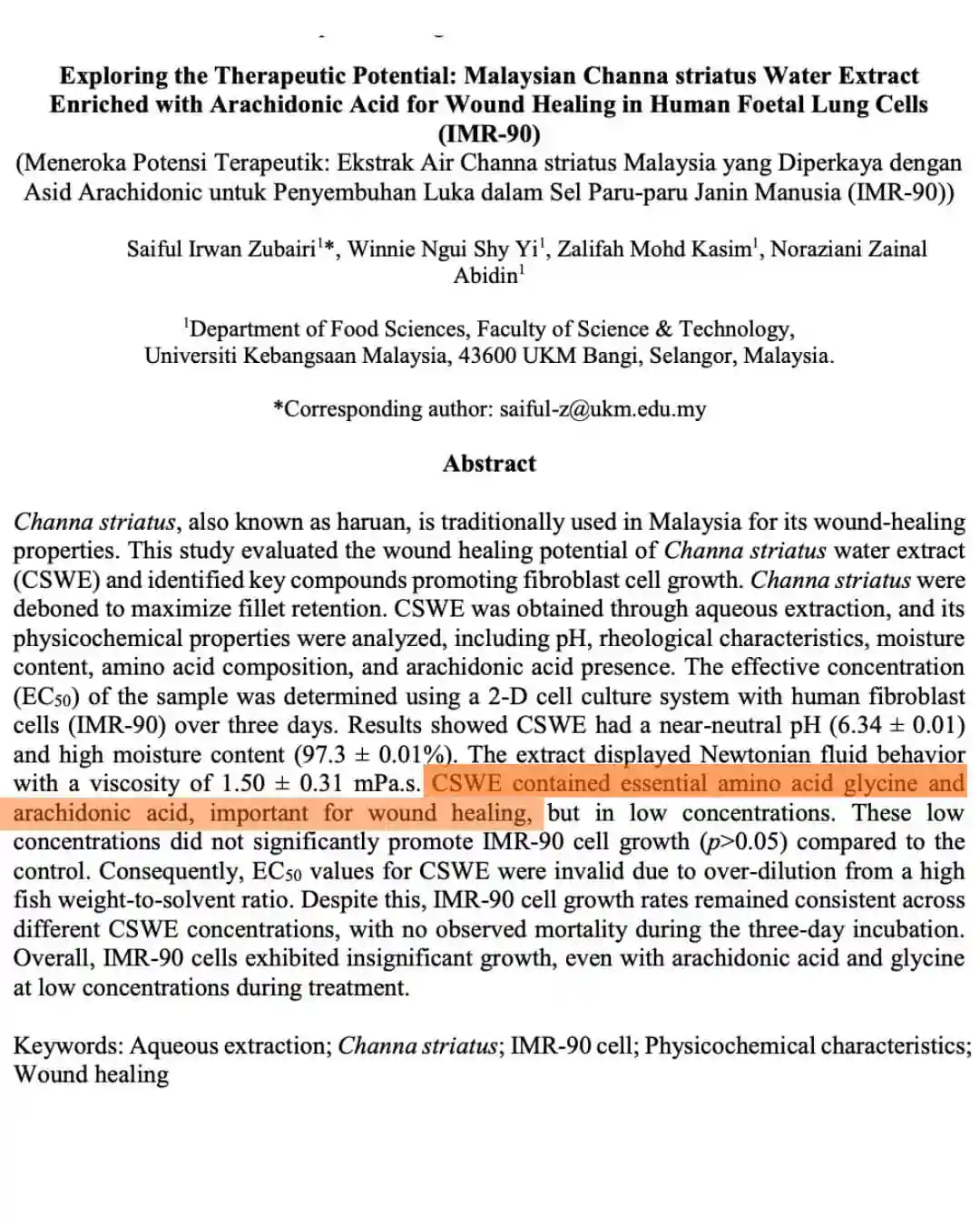Ekstrak air haruan terbukti mengandungi glycine & arachidonic acid – dua bahan penting dalam fasa utama penyembuhan luka: inflamasi, proliferasi & remodelling.